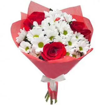 • Стандарт - роза 3 шт, кустовая хризантема 2 шт, зелень, упаковка, лента