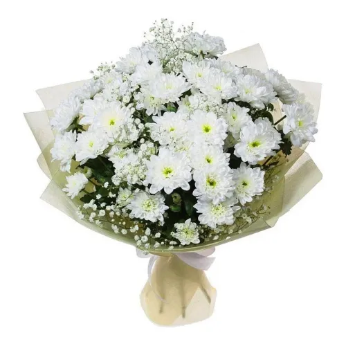 • Стандарт - кустовая хризантема - 5 шт., гипсофила, упаковка, лента