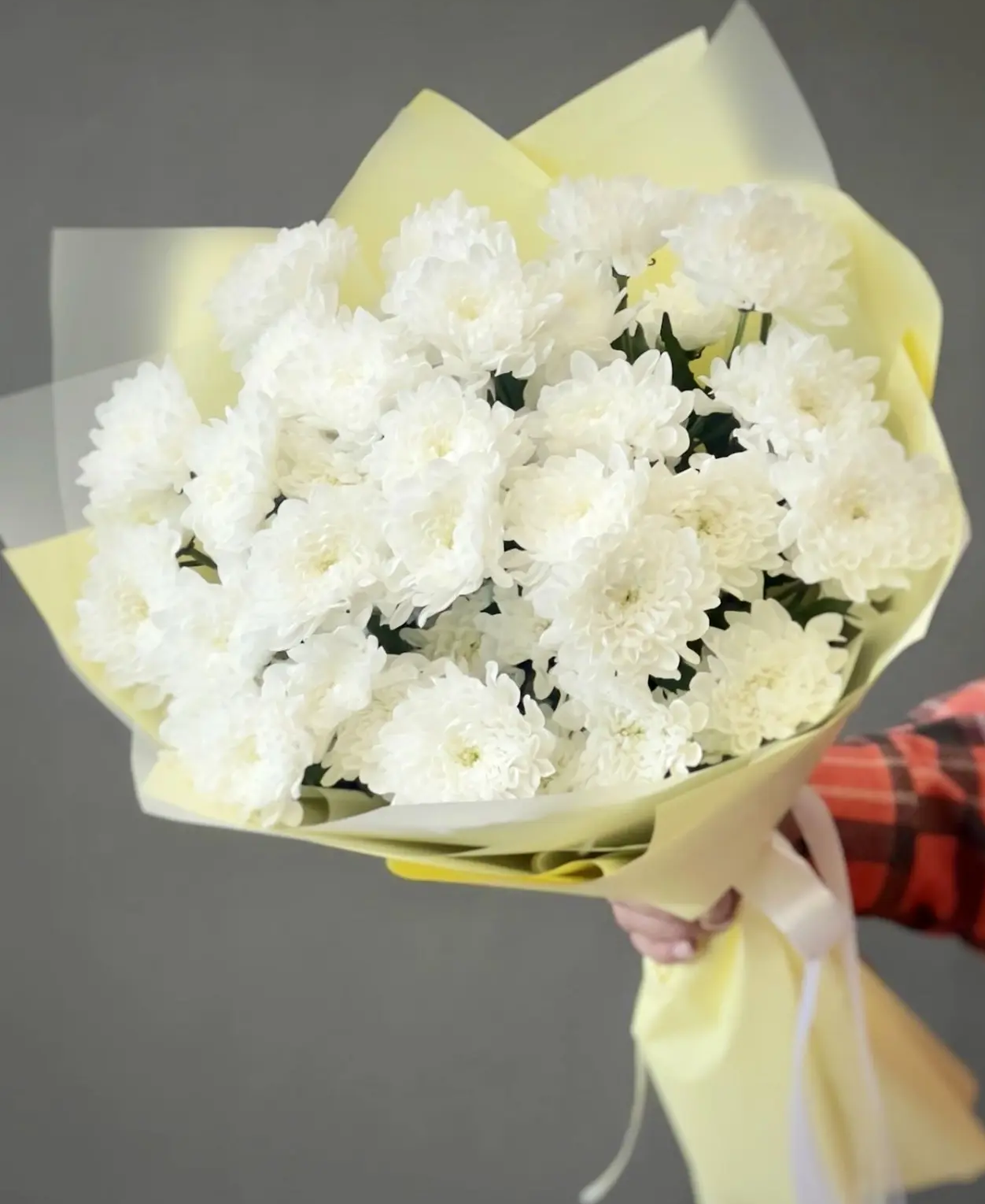 Нежный и элегантный букет из белой кустовой хризантемы - воплощение чистоты, искренности и утончённой красоты. Пышные соцветия создают воздушный объём, а белоснежные лепестки символизируют гармонию и светлые чувства. Букет оформлен в стильную упаковку, которая подчёркивает его изысканность и делает композицию завершённой.