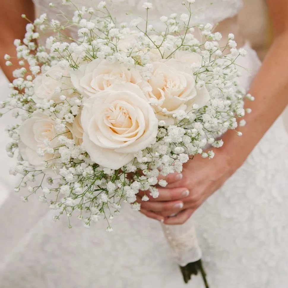 Букет невесты из белых роз и гипсофилы.