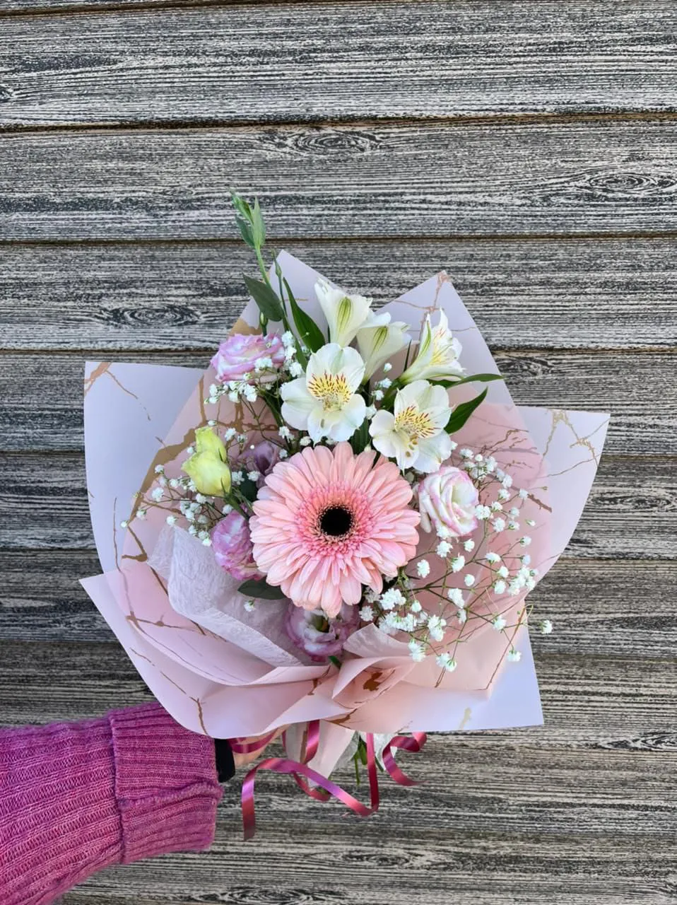 Объединенные вместе, герберы, альстромерии, гипсофила и эустома создают великолепное зрелище, которое привлекает внимание и вызывает восхищение. Такой букет станет идеальным подарком для любого случая — будь то день рождения, юбилей или просто знак внимания, способный донести искренние чувства и радость общения.