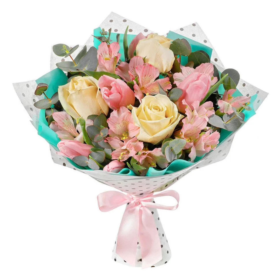 • Средний - роза - 5 шт., альстромерия - 5 шт., тюльпан - 5 шт., зелень, упаковка, лента