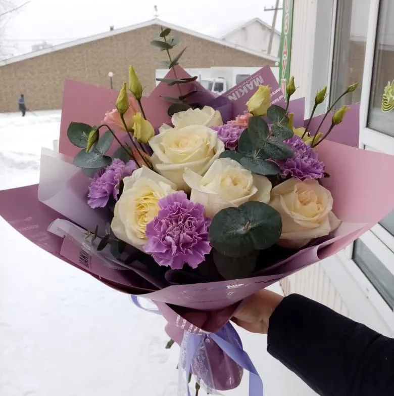 Собранный букет из роз, гвоздик и эустом — это истинное воплощение красоты и гармонии. Каждый цветок в этом изяществе по-своему уникален и в то же время создает невероятный ансамбль.