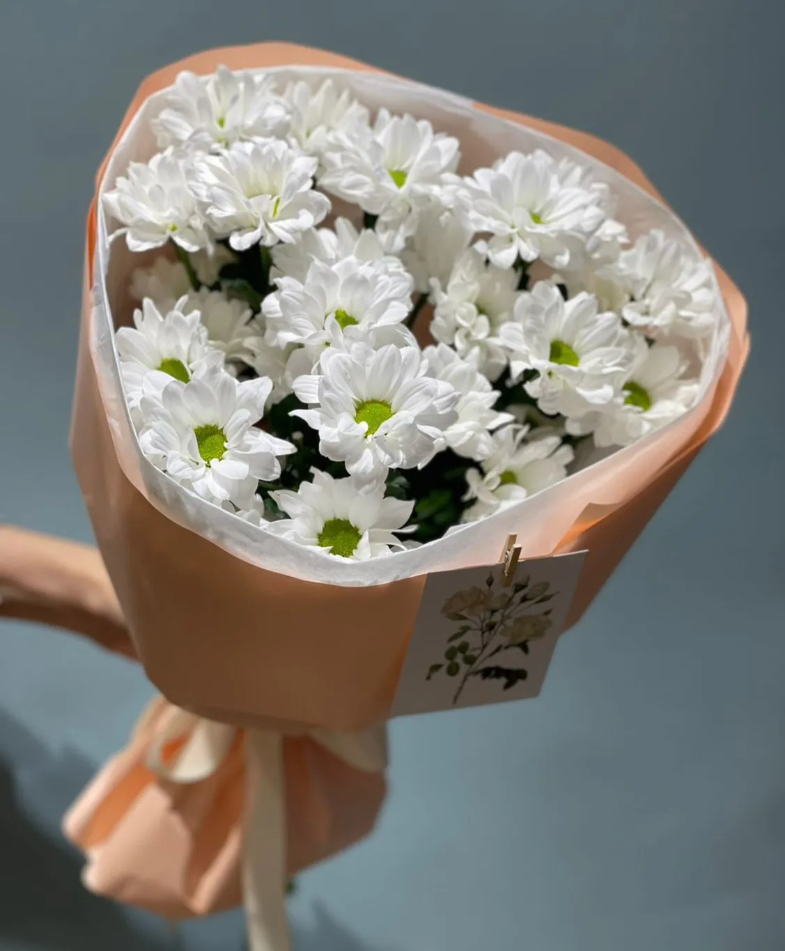 Такой букет станет отличным подарком для дорогого человека или стильным украшением для любого интерьера. Он приносит чувство спокойствия и радости, напоминая о красоте природы и волшебных моментах жизни. Каждая ромашковая хризантема в букете – это маленькое произведение искусства, способное украсить любой день.