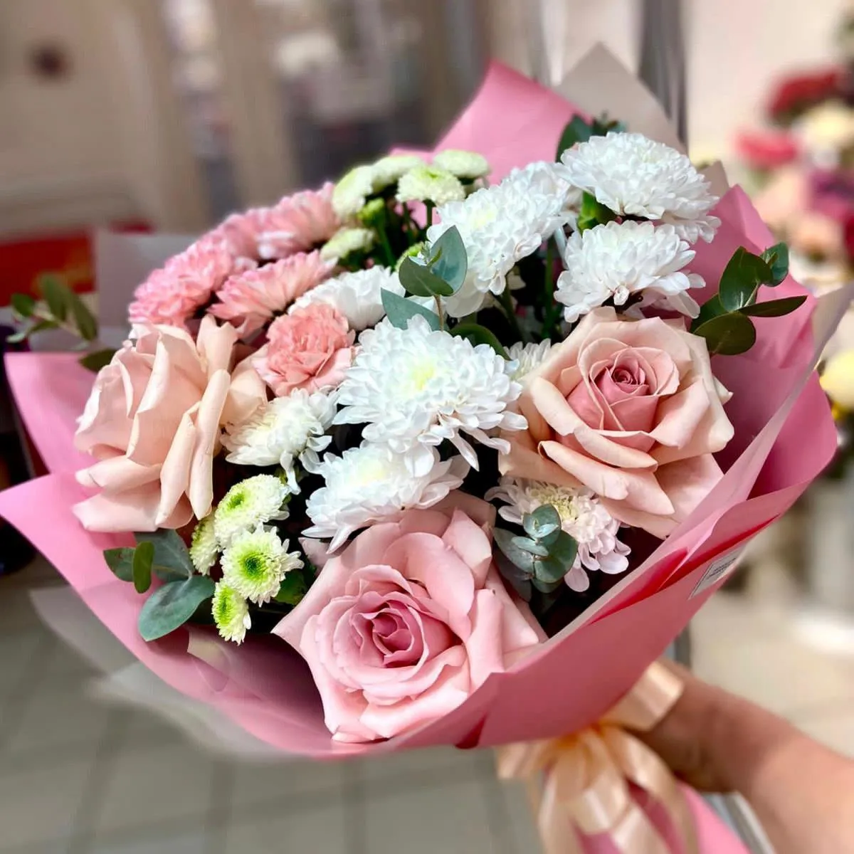 • Средний (роза - 5 шт., кустовая хризантема - 4 шт., зелень, упаковка, лента)