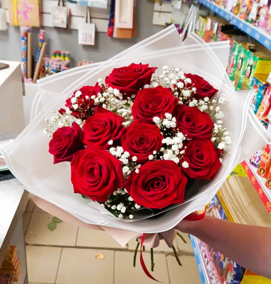 • Премиум - роза - 11 шт., гипсофила, упаковка, лента