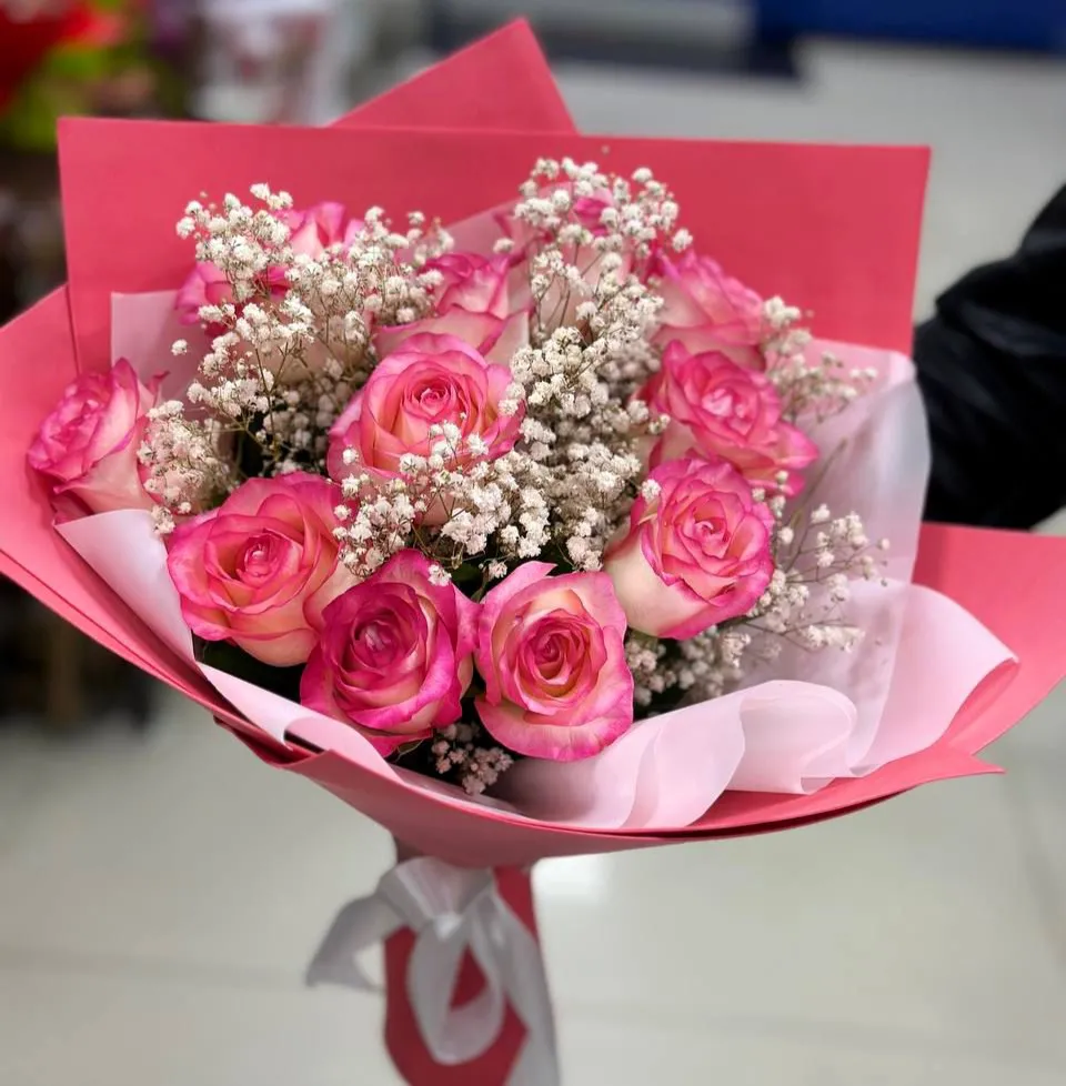 - Средний - роза - 9 шт., гипсофила, упаковка, лента