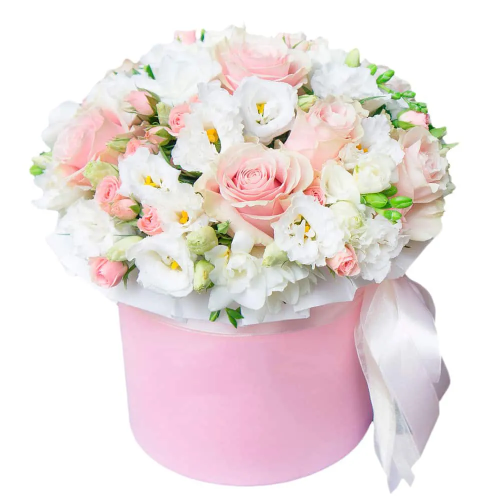 • Стандарт - эустома - 5 шт., роза - 5 шт., роза кустовая - 2 шт., шляпная коробка, оазис