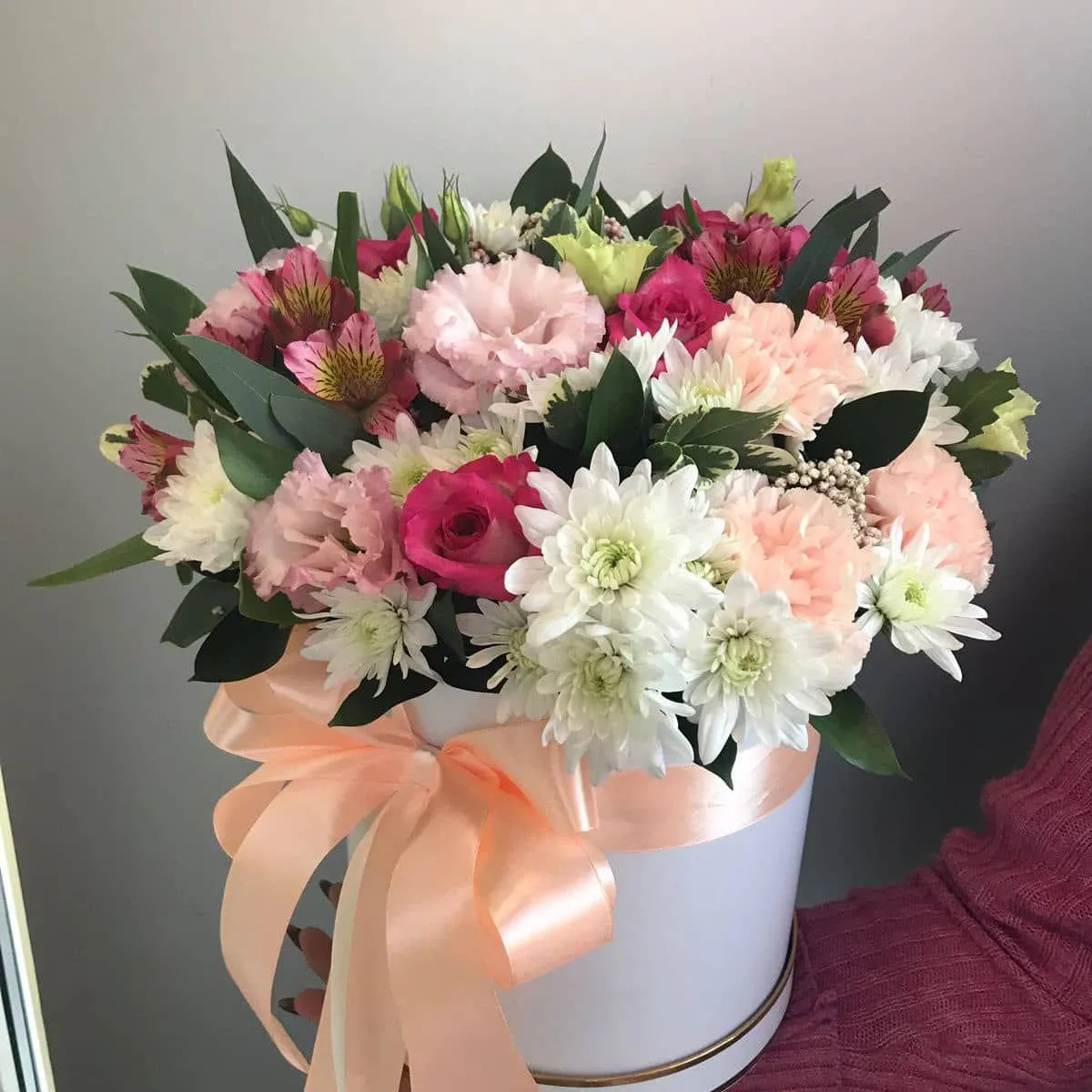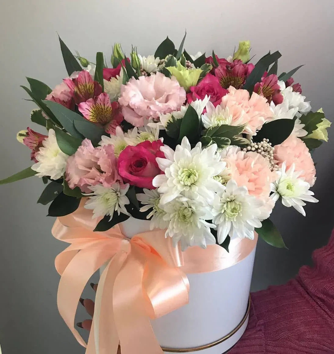 Шляпная коробка, наполненная яркими и нежными цветами — это истинное воплощение эстетики и утонченности. Внутри её раскрывается гармония хризантем, розовых роз, эустомы и гвоздики, создавая незабываемую композицию.