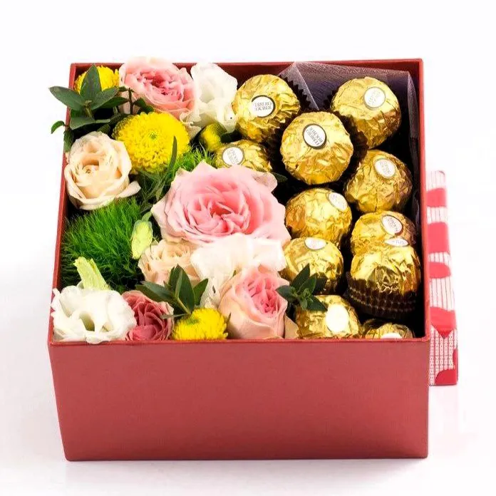 Подарите себе или своим близким настоящий праздник в красивой шляпной коробке, наполненной изысканными шоколадными конфетами Ferrero Rocher. Этот восхитительный десерт, обрамлённый нежными цветами, станет замечательным акцентом любого торжества.