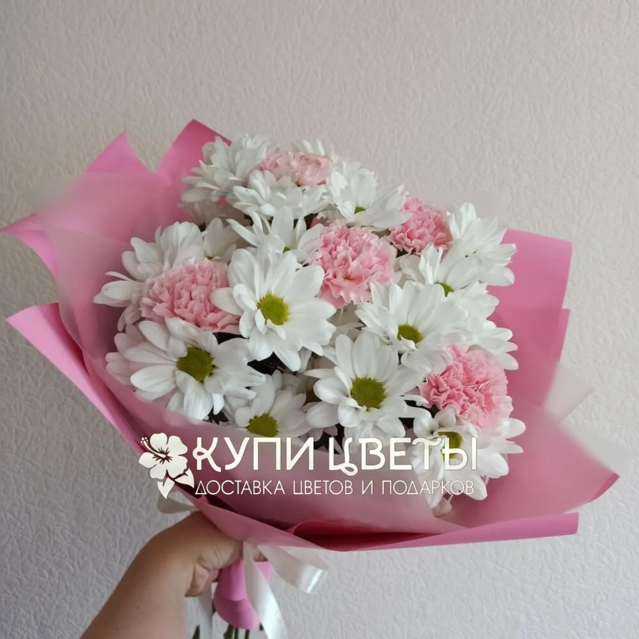 Гвоздики, кустовые хризантемы, упаковка, лента