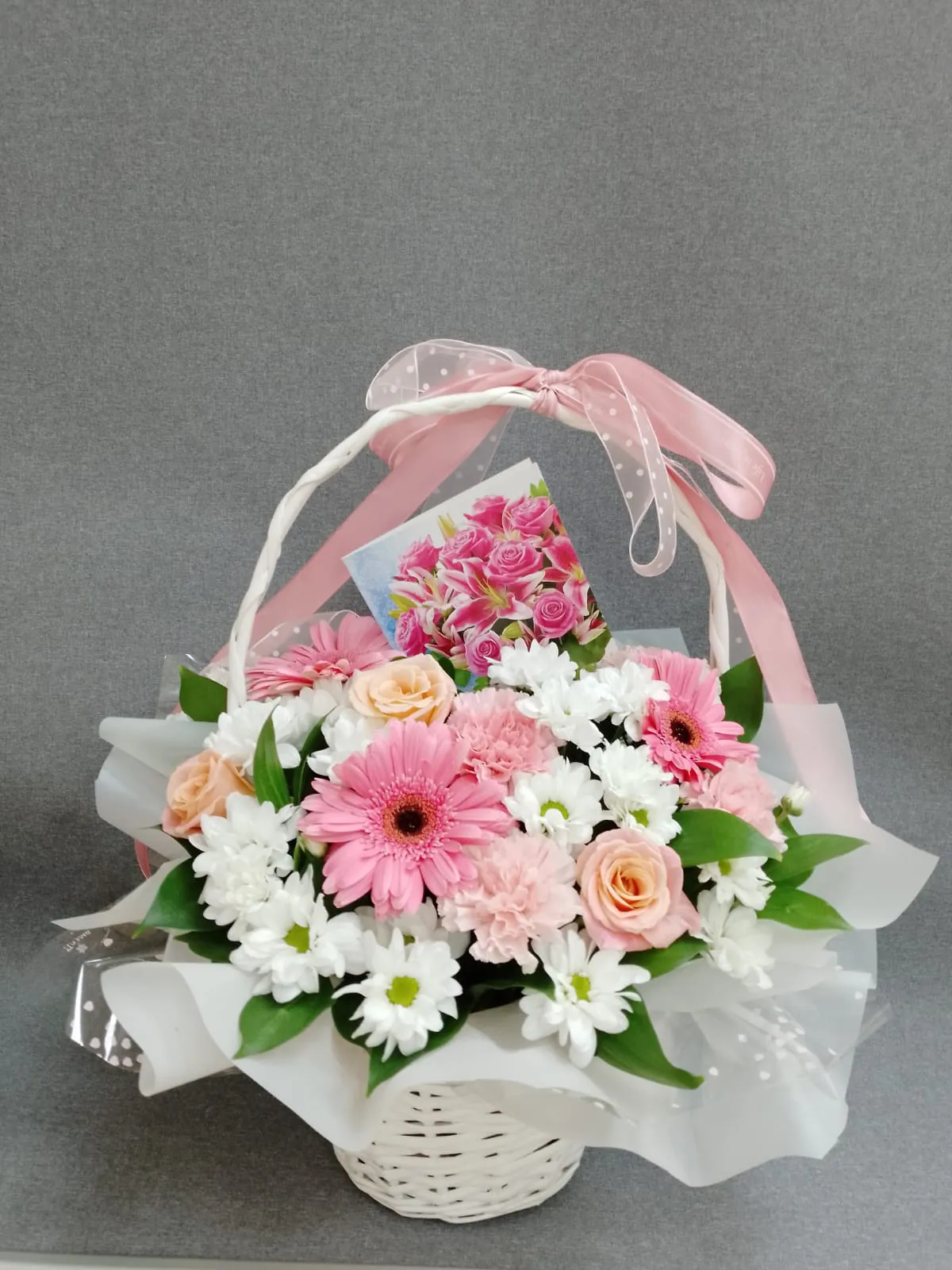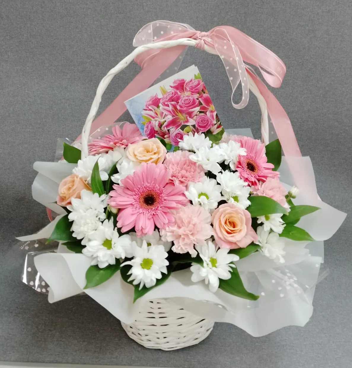 Одноголовая роза, гербера, гвоздика, кустовая хризантема, зелень, корзина, лента