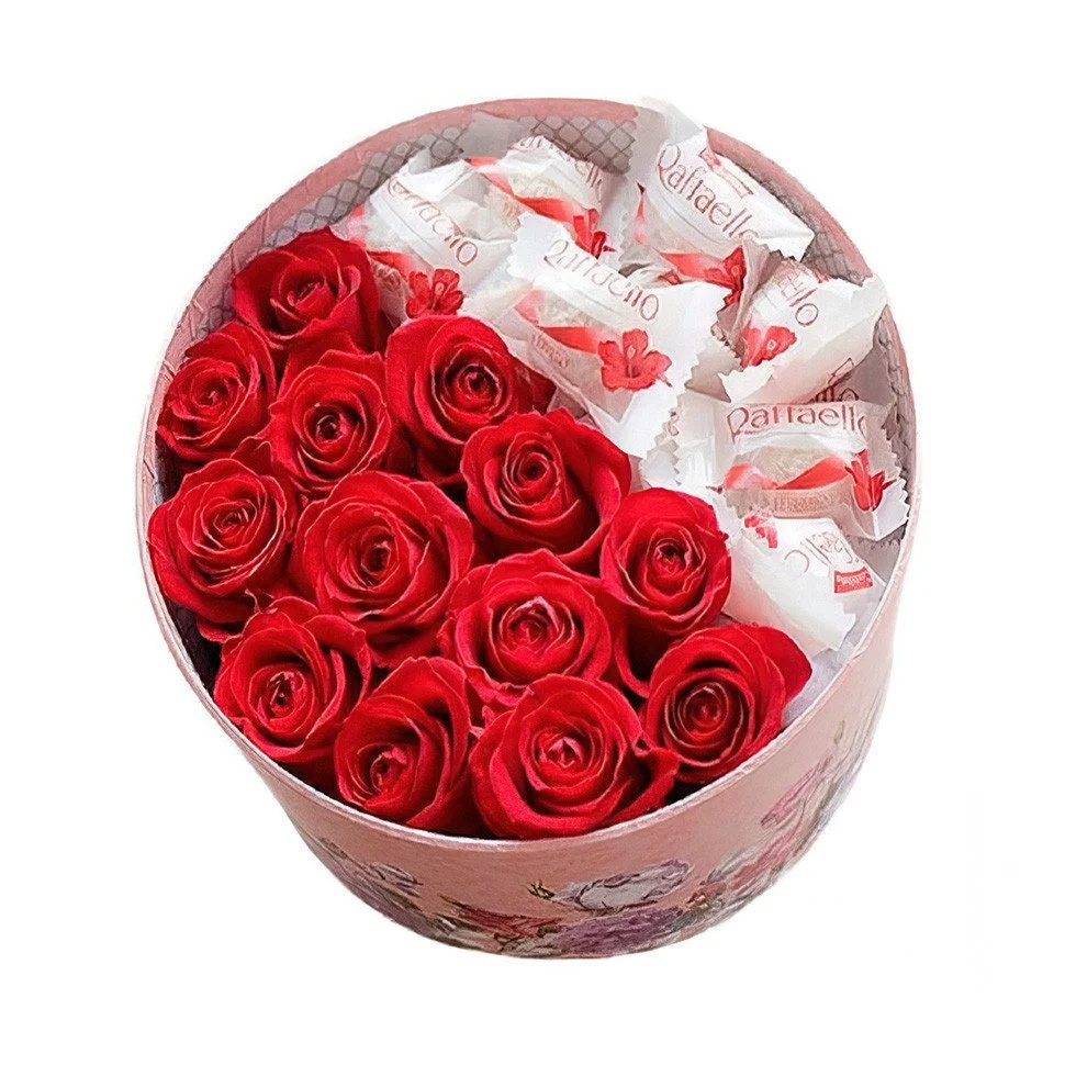 Вариант—Состав: роза - 11 шт., оазис, коробка, коробка конфет Raffaello (150 гр.)