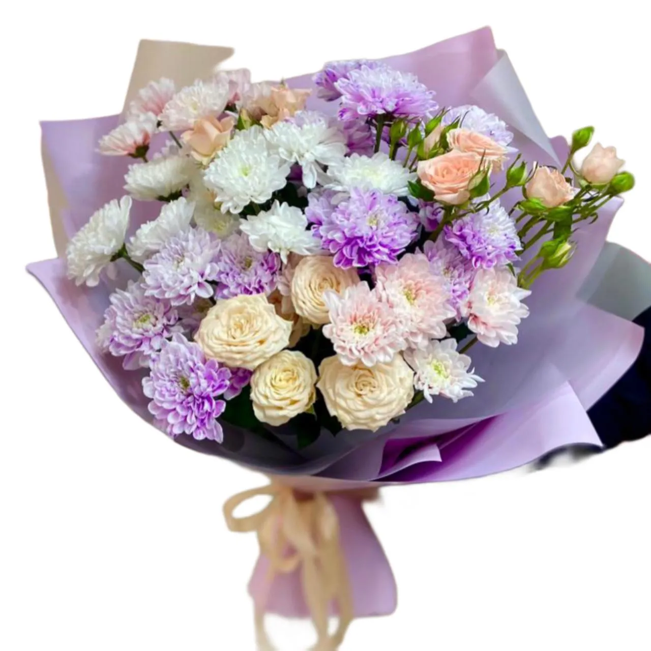 Кустовая хризантема, кустовая роза, упаковка, лента
