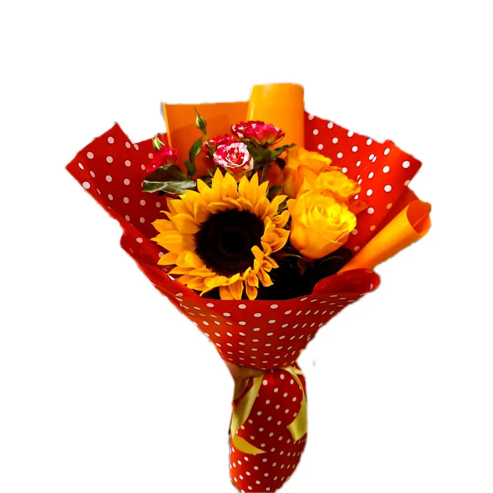 Вариант—Стандарт - роза - 3 шт., кустовая роза - 1 шт., подсолнух - 1 шт., зелень, упаковка, лента